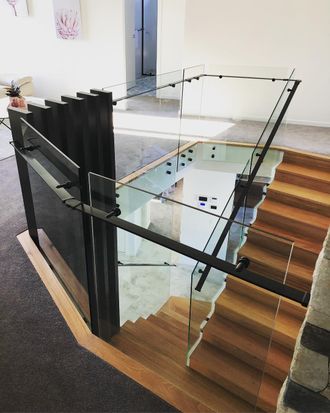 В данном проекте использовано точеченое крепление стекла (косоур и стена), крепление на мини-стойки, изготовлен индивидуальный поручень и окраска фурнитуры. Подобные решения используются и в уличном остеклении (террасы, балконы).