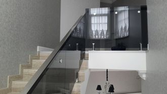 Стеклянное ограждение лестницы на мини-стойках с поручнем из стали на отводах - выполняется на сером, прозрачном и бронзовом стекле различной толщины. Подобные ограждения мы можем установить внутри помещения и на улице (балконы, террасы, смотровые крыши).