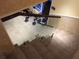 Стеклянное ограждение лестницы на мини-стойках с деревянным круглым поручнем - относительно экономичное решение, поручень может иметь различный цвет покрытия.